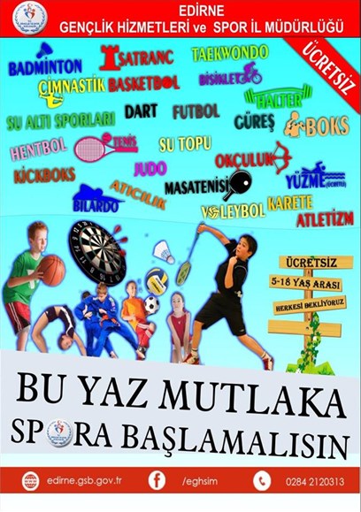 Geleceğin elit sporcularını kazandırmak çocuk ve gençlerin yaz tatillerini değerlendirebilmeleri amacıyla Edirne Gençlik Hizmetleri ve Spor İl Müdürlüğü tarafından 6-16 yaş grubundaki çocuk ve gençlere yönelik olarak 25 branşta Yaz Spor Okulu açılıyor.